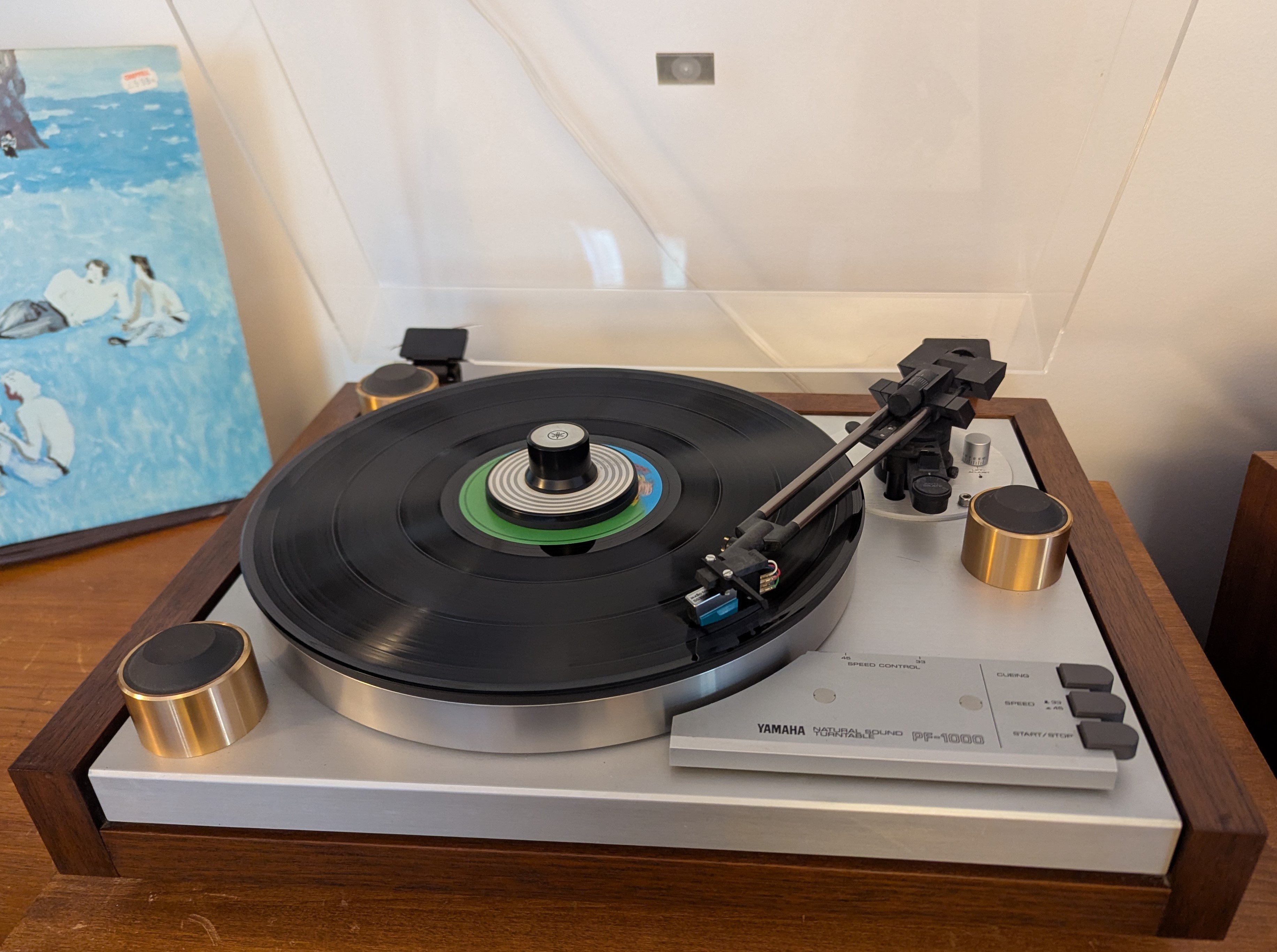 This is a magnificent turntable. The specs on it are crazy. A belt drive that has better wow and flutter than a quartz-locked direct drive? And has adjustable pitch? Yeah. And look at that over-engineered beast of a tonearm. Check out the marketing brochure to see more of the lengths Yamaha went to on this beauty. And she’s quite the looker too — real wood frame and gold suspension pillars. I have a lot of turntables to choose from and this was my daily player for a good while. This particular unit is in very nice shape as is the dust cover. Comes fitted with a brand new Audio Technica AT112EP cartridge, but I’m happy to put the cartridge of your dreams on it. This likely won’t last long.